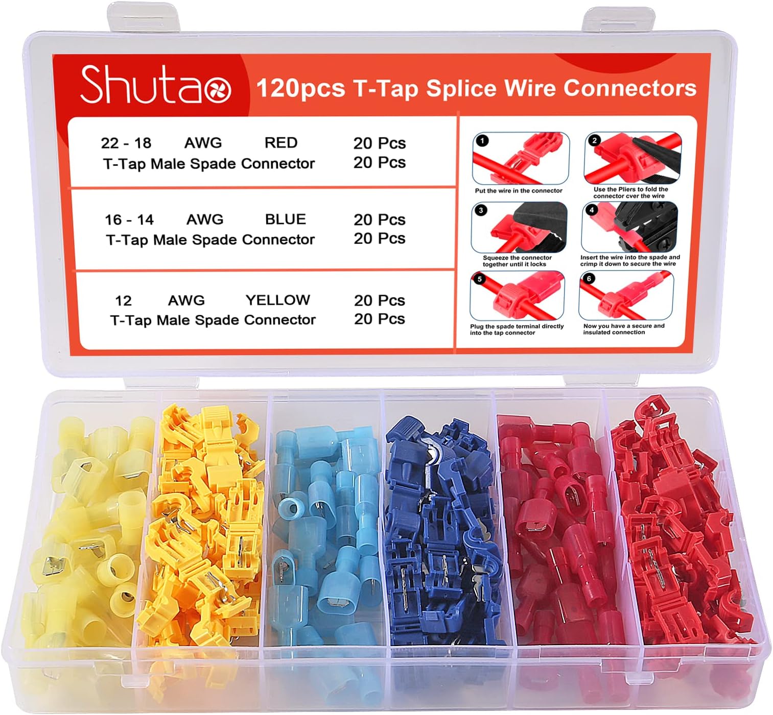 120 Pcs T-Tap Wire Connectors, T-Tap Wire Terminals Self-Stripping Quick Splice Electrical Wire Terminals, Insulated Male Quick Disconnect Spade Terminals Assortment Kit