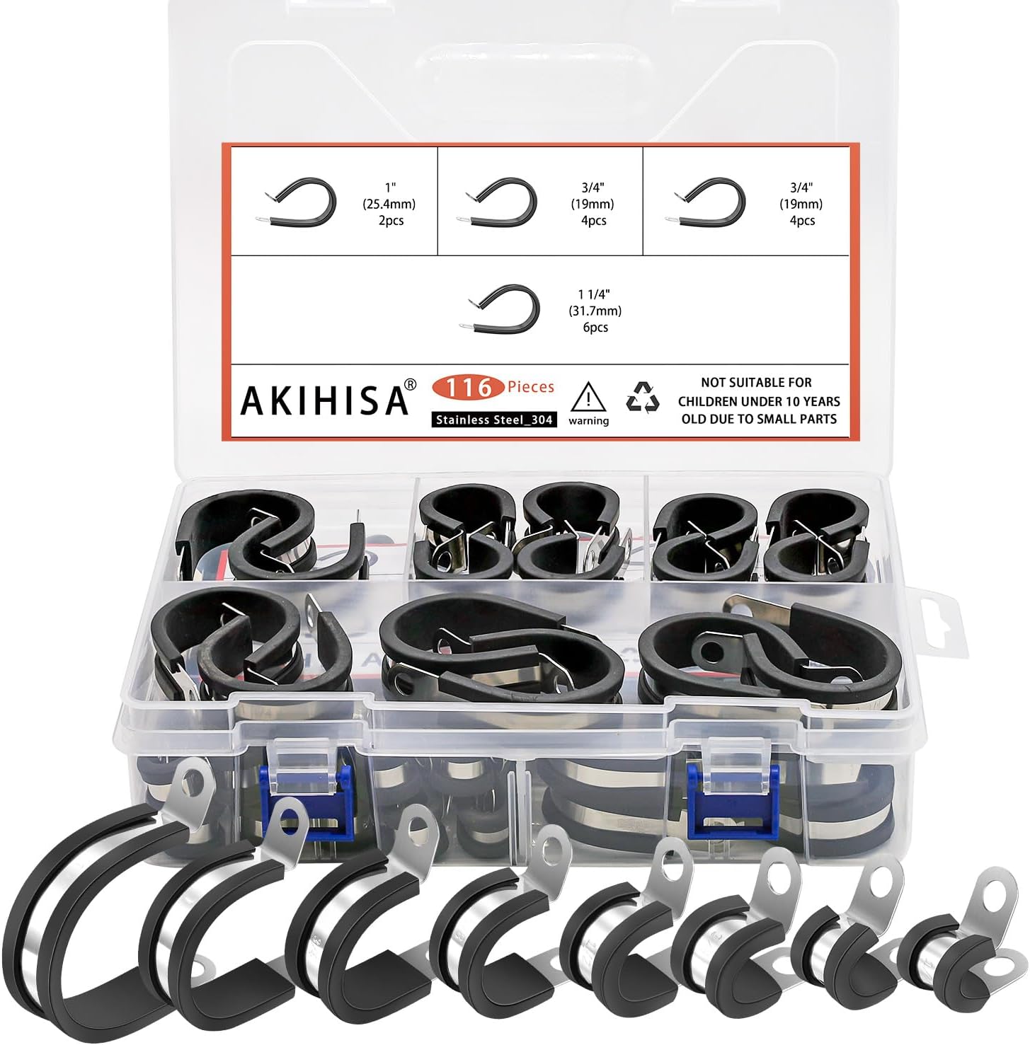 AKIHISA 116pcs Cable Clamps Assortment Kit, 8 Sizes 1/4″ 5/16″ 3/8″ 1/2″ 5/8″ 3/4″ 1″ 1-1/4″ 304 Stainless Steel Rubber Coated Cushioned Insulated Cable Clamp, Pipe Clamp for Pipes and Hoses