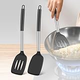 2 Pack Silicone Spatula Set – Solid Turner and Slotted Turner with Heat-Resistant Silicone Heads and Stainless Steel Core, Non-Scratch Kitchen Utensils for Cooking, Baking, Flipping, and Frying, Black