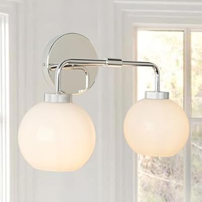 17 Inch Modern Glass Globe Double Sconce, Polished Chrome Metal Finish Wall Light for Bedroom, Hand-Polished Milky Glass Shade Vanity Light Over Mirror, Elegant Light Fixtures for…