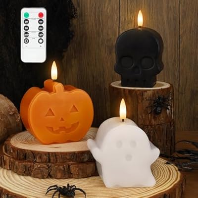 Halloween Flameless Candles with Remote, Real Wax Ghost, Pumpkin, Skull Battery Operated Candles, Flickering LED Fake Candle, Halloween Decorations for Table, fireplace, Home, Par…