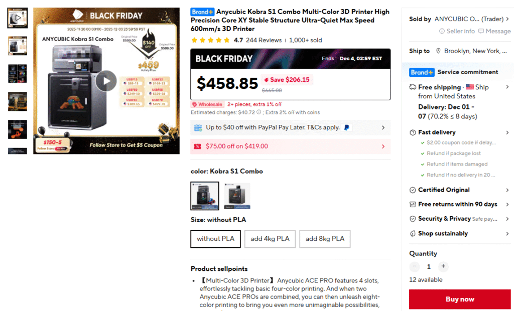 ExpiredANYCUBIC Kobra S1 Combo. November 27, 2025 FDMAliExpress Deal Score0 0 $338.85 Go To Store AEUS80 Deal Score0 $338.85 Go To Store AEUS80 Anycubic Kobra S1 Combo Multi-Color 3D Printer High Precision Core XY Stable Structure Ultra-Quiet Max Speed 600mm/s 3D Printer $338.85 GO TO STORE Aliexpress Price after code AEUS80 at checkout, and $40 off PayPal promo.