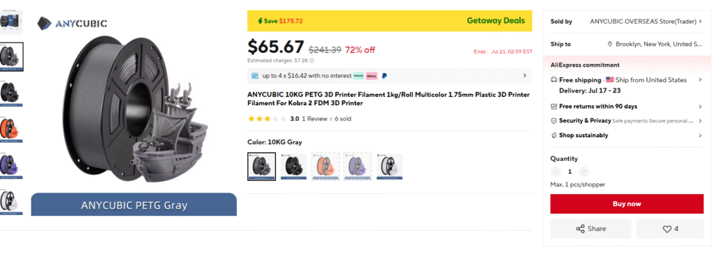 ExpiredANYCUBIC PETG 10 packs (10kg). Black, White, Gray. July 15, 2025 PLAAliExpress Deal Score+2 0 $65.67 Go To Store Deal Score+2 $65.67 Go To Store Sadly, none of the checkout codes work on this listing… but at this price it doesn’t really matter 🙂 ANYCUBIC 10KG PETG 3D Printer Filament 1kg/Roll Multicolor 1.75mm Plastic 3D Printer Filament For Kobra 2 FDM 3D Printer $65.67 GO TO STORE Aliexpress
