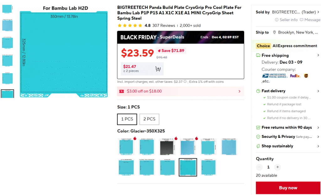 BIGTREETECH Panda CryoGrip Glacier for Bambu H2D (350x325mm). November 24, 2025 PartsAliExpress Deal Score0 0 $19.59 Go To Store Deal Score0 $19.59 Go To Store BIGTREETECH Panda Build Plate CryoGrip Pro Cool Plate For Bambu Lab P1P P1S A1 X1C X1E A1 MINI CryoGrip Sheet Spring Steel $19.59 GO TO STORE Aliexpress Price after code AEUS04 at checkout.