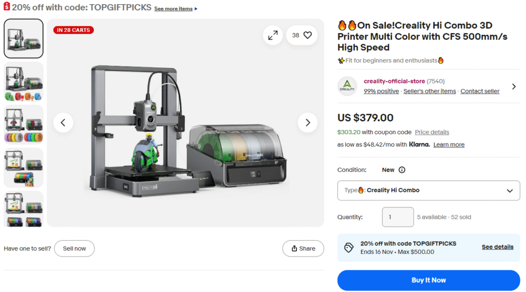 ExpiredCREALITY Hi Combo. November 10, 2025 FDMEbay Deal Score0 0 $303.20 Go To Store TOPGIFTPICKS Deal Score0 $303.20 Go To Store TOPGIFTPICKS 🔥🔥On Sale!Creality Hi Combo 3D Printer Multi Color with CFS 500mm/s High Speed $303.20 GO TO STORE Price after code TOPGIFTPICKS at checkout.