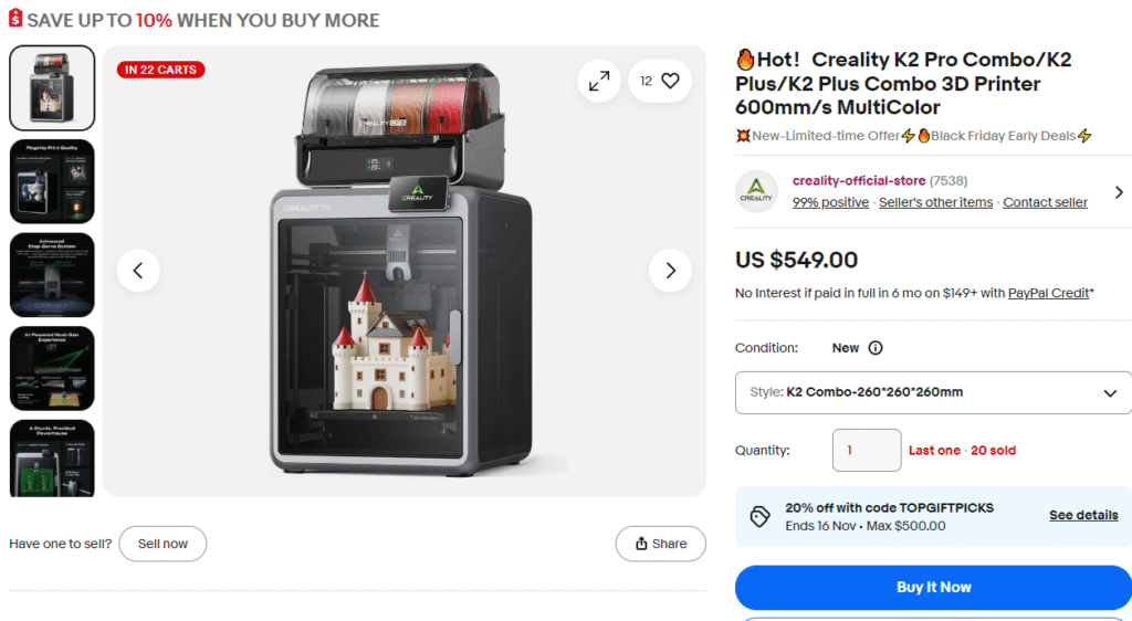 ExpiredCREALITY K2 Combo. November 10, 2025 FDMEbay Deal Score0 0 $439.20 Go To Store TOPGIFTPICKS Deal Score0 $439.20 Go To Store TOPGIFTPICKS 🔥Hot!Creality K2 Pro Combo/K2 Plus/K2 Plus Combo 3D Printer 600mm/s MultiColor $439.20 GO TO STORE Price after code TOPGIFTPICKS at checkout.