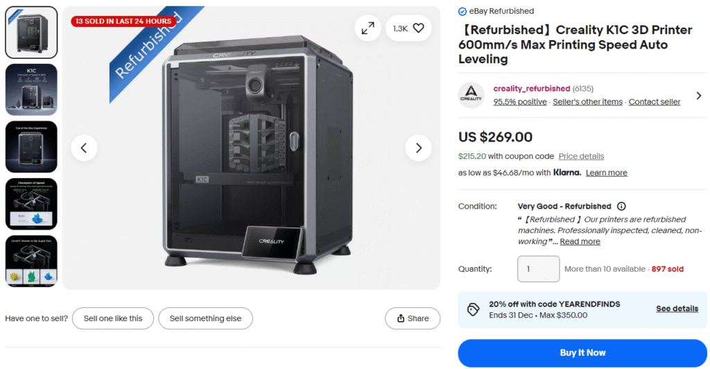 ExpiredCREALITY (Refurbished) K1C December 23, 2025 FDMEbay Deal Score+1 0 $215.20 Go To Store YEARENDFINDS Deal Score+1 $215.20 Go To Store YEARENDFINDS 【Refurbished】Creality K1C 3D Printer 600mm/s Max Printing Speed Auto Leveling $215.20 GO TO STORE Price after 20% off Ebay coupon.