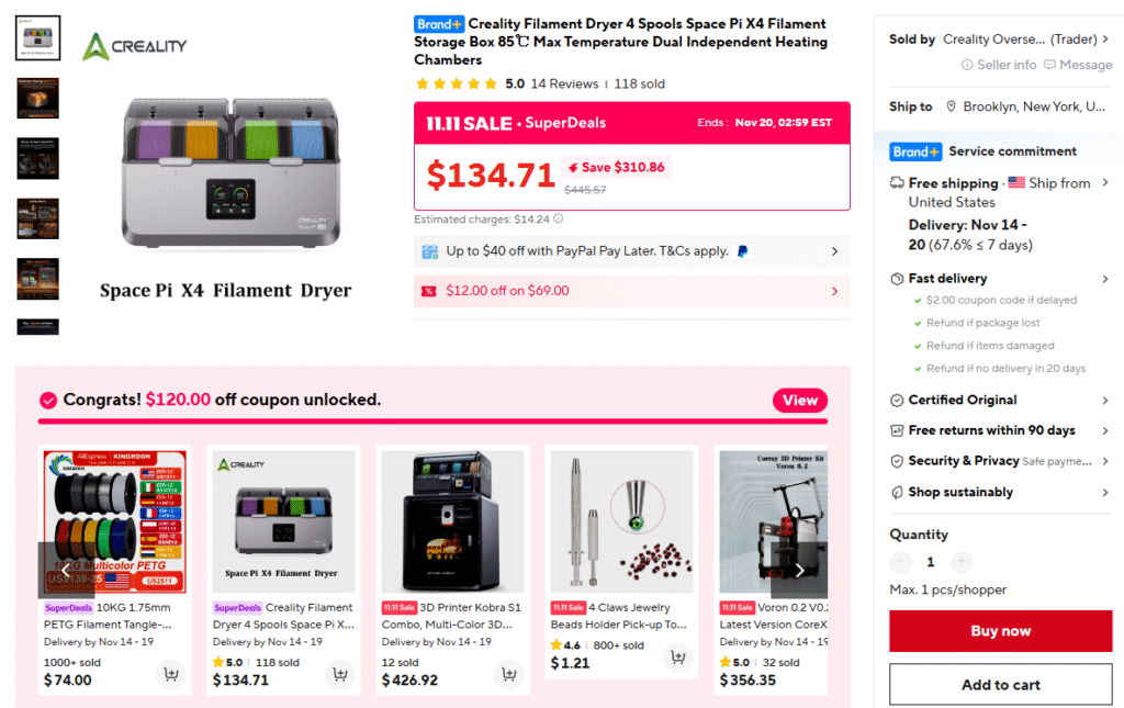 ExpiredCREALITY Space Pi X4 Filament Dryer. November 11, 2025 PartsAliExpress Deal Score0 0 $108.71 Go To Store AEUS26 Deal Score0 $108.71 Go To Store AEUS26 Creality Filament Dryer 4 Spools Space Pi X4 Filament Storage Box 85℃ Max Temperature Dual Independent Heating Chambers $108.71 GO TO STORE Aliexpress Price after code AEUS26 at checkout.