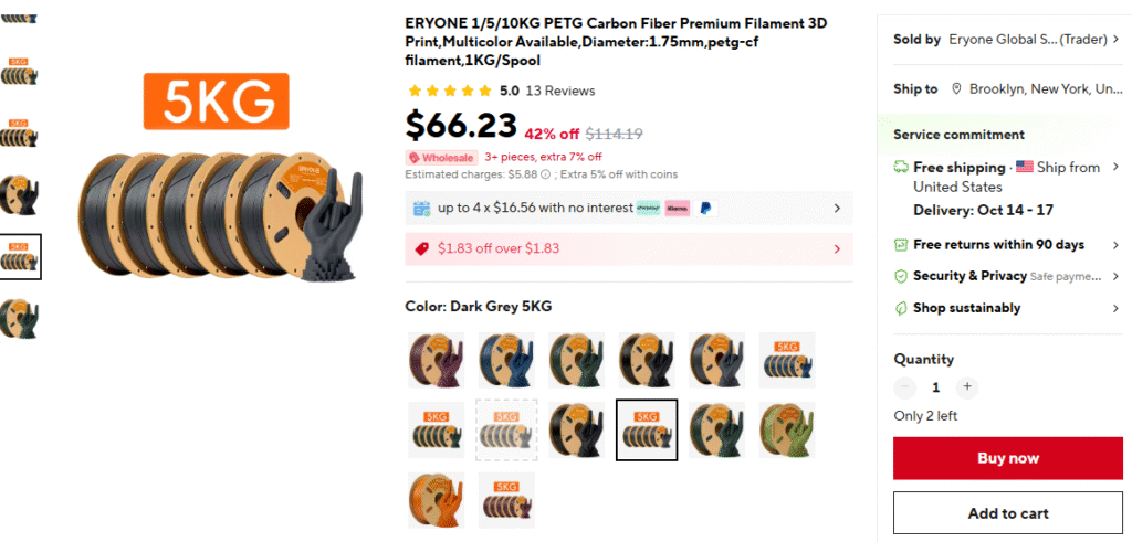ExpiredERYONE Carbon Fiber PETG 5 packs (5kg). October 9, 2025 PETGAliExpress Deal Score+1 0 $9.36/kg Go To Store USDEAL012 Deal Score+1 $9.36/kg Go To Store USDEAL012 ERYONE 1/5/10KG PETG Carbon Fiber Premium Filament 3D Print,Multicolor Available,Diameter:1.75mm,petg-cf filament,1KG/Spool $46.76 GO TO STORE Aliexpress Price after code USDEAL012 at checkout, $1.83 store coupon (clip on page), and $5.64 instant discount (auto applies).