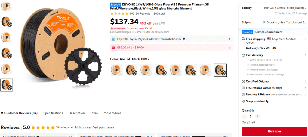 ERYONE 1/3/5/10KG Glass Fiber ABS Premium Filament 3D Print,Wholesale,Black White,10% glass fiber abs filament