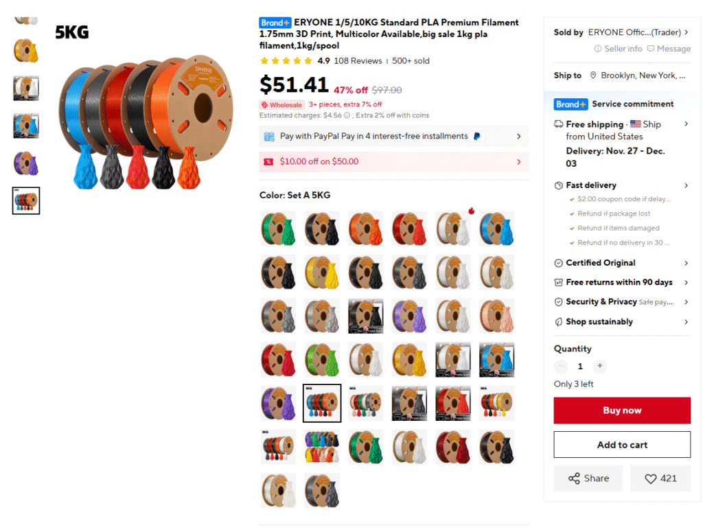 Variety packs start at $51, single colors at $49… in the end it doesn’t make a difference – they end up the same price. Use code AEUS08 ($8 off $40) or AEUS10 ($10 off $50). 10 pack can be had for $77 (code AEUS20 at checkout, $5 seller discount, $4 store coupon). You can do even better per kg by going for two 5 packs (ends up $73.82, see screenshot below).