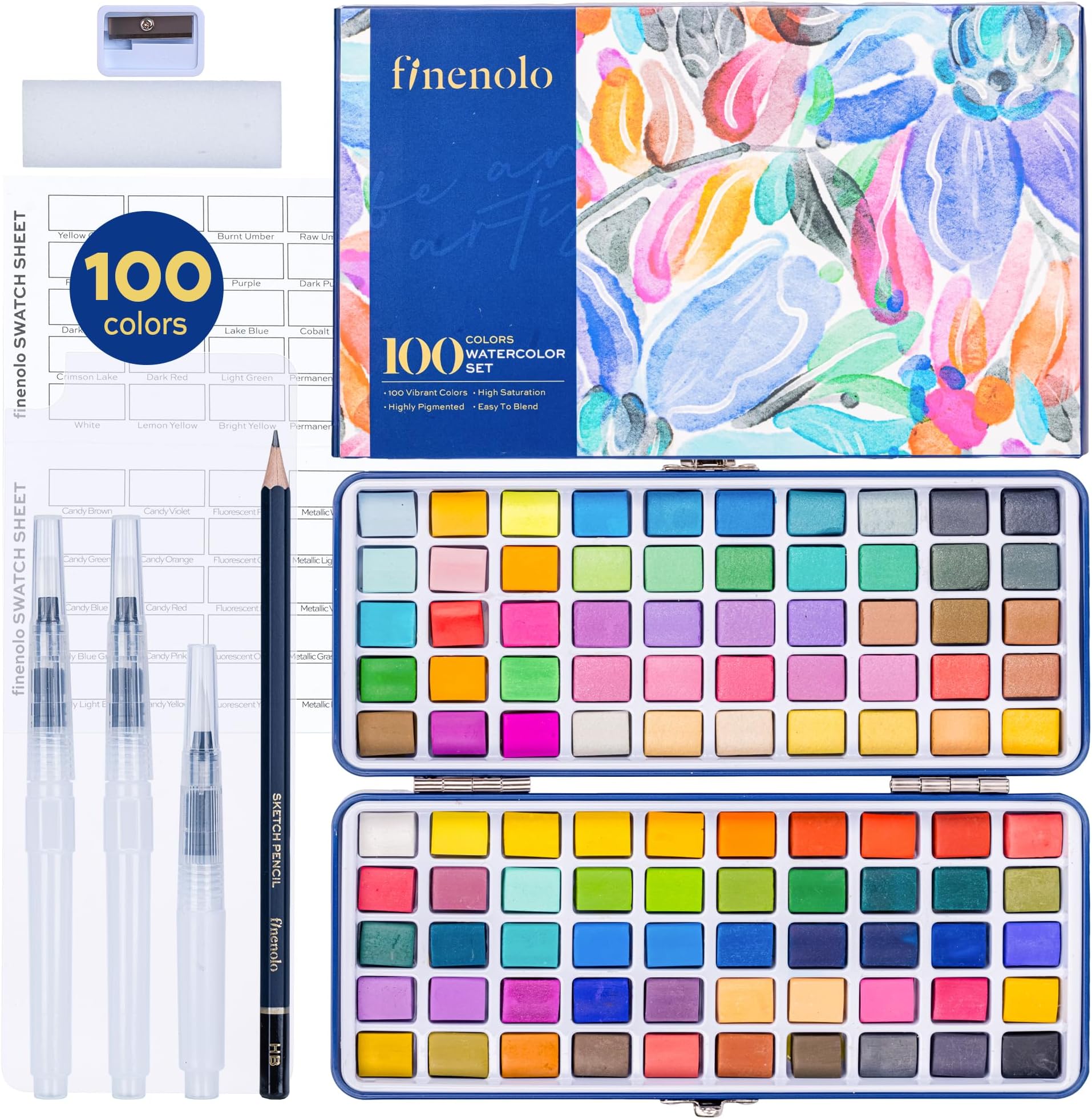 Finenolo 100 Colors Watercolor Paint Set with Metallic, Macaron & Fluorescent Colors-Professional Grade Watercolor Paints for Artists, Beginners & Illustrators, Ideal for Blending, Layering & Creative Artwork