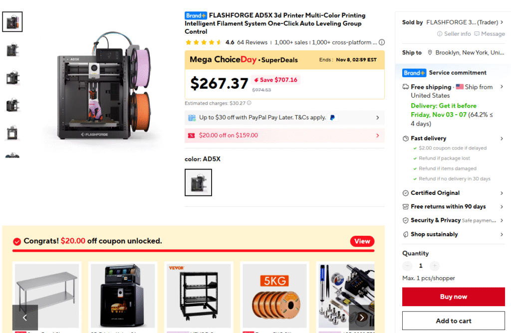 ExpiredFLASHFORGE AD5X. November 1, 2025 FDMAliExpress Deal Score0 2 $217.37 Go To Store USCD20 Deal Score0 $217.37 Go To Store USCD20 FLASHFORGE AD5X 3d Printer Multi-Color Printing Intelligent Filament System One-Click Auto Leveling Group Control $217.37 GO TO STORE Aliexpress Price after code USCD20 at checkout, and $30 off instant discount (pay with PayPal).