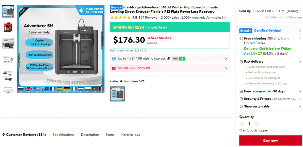 ExpiredFLASHFORGE Adventurer 5M April 13, 2026 FDMAliExpress Deal Score0 0 $151.30 Go To Store USAA25 Deal Score0 $151.30 Go To Store USAA25 Update: Found a better deal here... expiring this one. Flashforge Adventurer 5M 3d Printer High Speed Full-auto Leveling Direct Extruder Flexible PEI Plate Power Loss Recovery $151.30 GO TO STORE Aliexpress Price after code USAA25 at checkout.