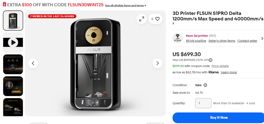 ExpiredFLSUN S1 Pro Delta. November 22, 2025 FDMEbay Deal Score0 0 $599.30 Go To Store FLSUN3DWINT25 Deal Score0 $599.30 Go To Store FLSUN3DWINT25 Can potentially be had 20% cheaper (~$480’ish) with PayPal Cashback… 3D Printer FLSUN S1PRO Delta 1200mm/s Max Speed and 40000mm/s $599.30 GO TO STORE Price after code FLSUN3DWINT25 at checkout.