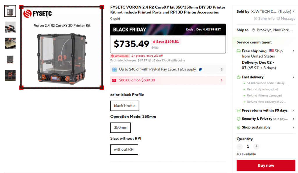 ExpiredFYSETC Voron 2.4 R2 Kit (350mm). November 27, 2025 KitsAliExpress Deal Score0 0 $585.49 Go To Store AEUS100 Deal Score0 $585.49 Go To Store AEUS100 FYSETC VORON 2.4 R2 CoreXY kit 350*350mm DIY 3D Printer Kit not include Printed Parts and RPI 3D Printer Accessories $585.49 GO TO STORE Aliexpress Price after code AEUS100 at checkout, $10 off store coupon (clip on page), and $40 off PayPal promo.