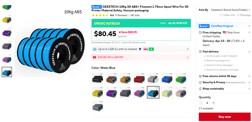 GEEETECH 10Kg 3D ABS+ Filament 1.75mm Spool Wire For 3D Printer Material,Safety, Vacuum packaging