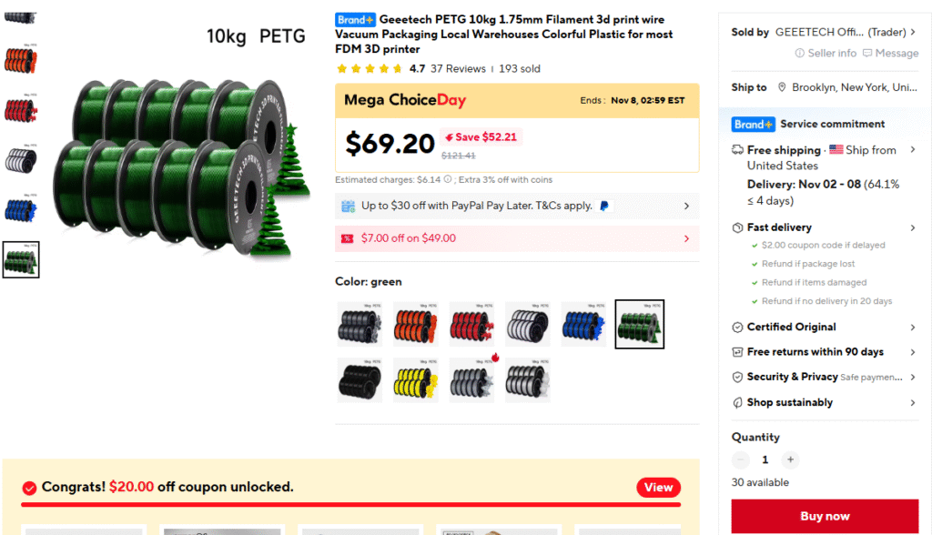 ExpiredGEEETECH PETG 10 packs (10kg). November 1, 2025 PETGAliExpress Deal Score+1 0 $5.72/kg Go To Store USDEAL012 Deal Score+1 $5.72/kg Go To Store USDEAL012 Geeetech PETG 10kg 1.75mm Filament 3d print wire Vacuum Packaging Local Warehouses Colorful Plastic for most FDM 3D printer $57.20 GO TO STORE Aliexpress Price after code USDEAL012 at checkout.