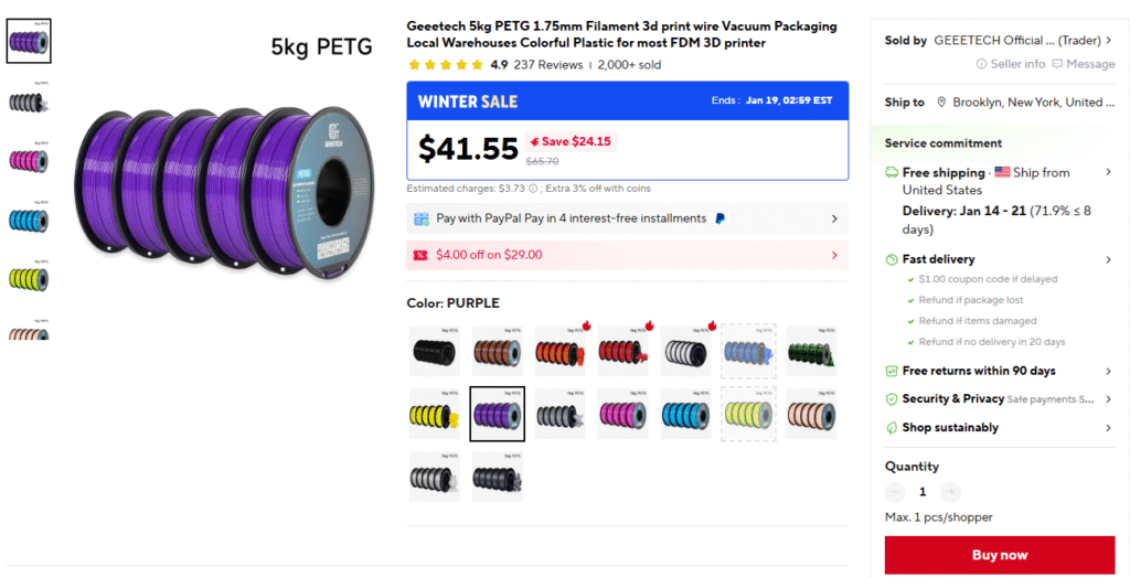 ExpiredGEEETECH PETG 5 packs (5kg). January 12, 2026 PETGAliExpress Deal Score+2 0 $7.51/kg Go To Store USWS04 Deal Score+2 $7.51/kg Go To Store USWS04 Geeetech 5kg PETG 1.75mm Filament 3d print wire Vacuum Packaging Local Warehouses Colorful Plastic for most FDM 3D printer $37.55 GO TO STORE Aliexpress Price after code USWS04 at checkout.
