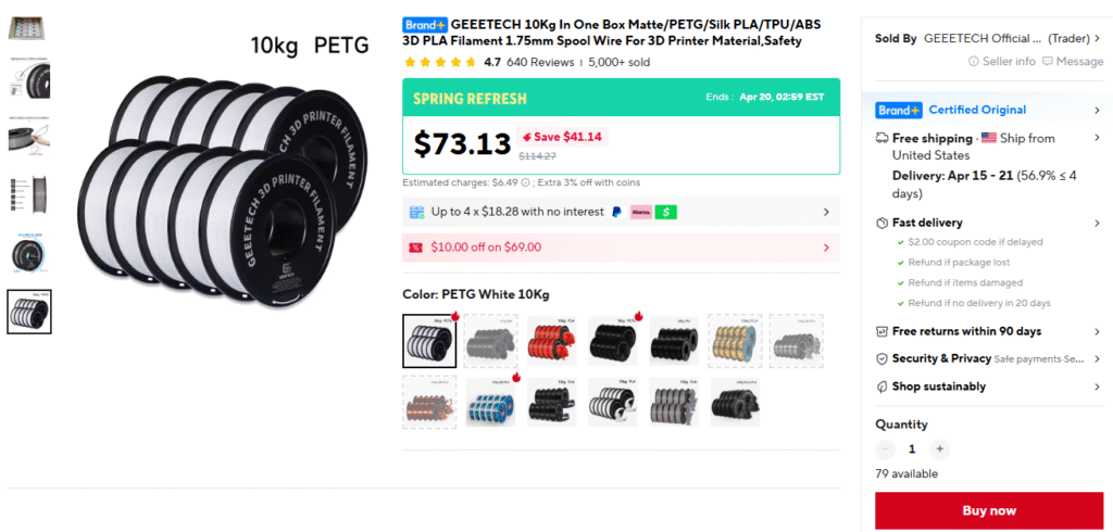 GEEETECH PETG (Black, White), PLA (Black) 10 packs (10kg).