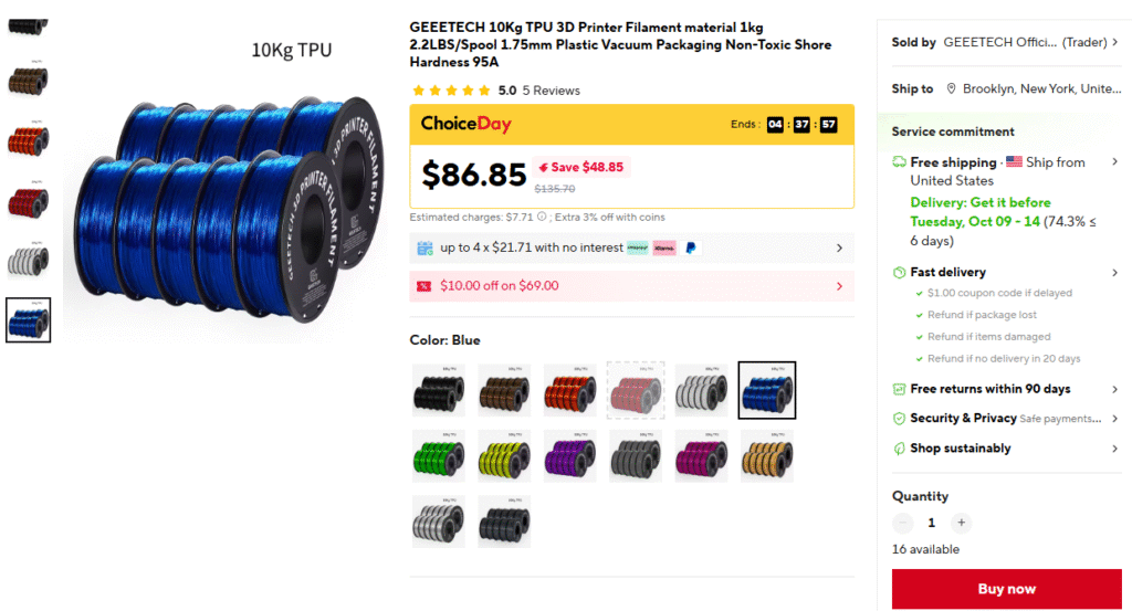 GEEETECH 10Kg TPU 3D Printer Filament material 1kg 2.2LBS/Spool 1.75mm Plastic Vacuum Packaging Non-Toxic Shore Hardness 95A