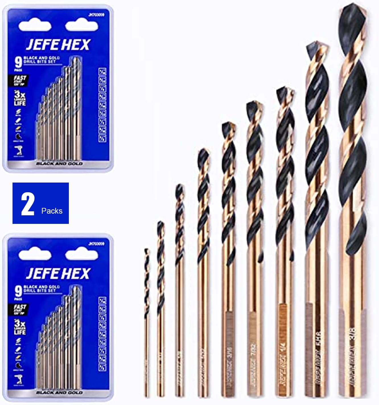 JEFE HEX 9set*2packs Twist Drill Bits Set, 3-Flat Shank for Anti-Walking, 135° Split Point, Black & Gold Coated, Jobber Length for General Purpose