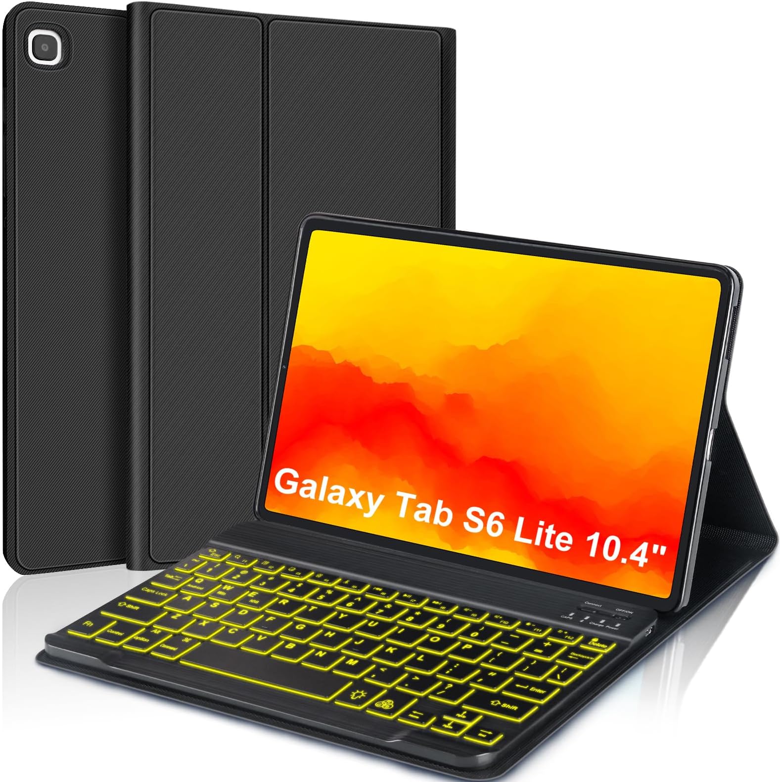 Samsung S6 Lite Tablet 10.4 Inch 2022/2020 Case with Keyboard, Smart 7 Colors Backlight and Detachable Wireless Bluetooth Keyboard & PU Folio Stand Cover Case for Tab SM-P610/P613/P615/P619,Black