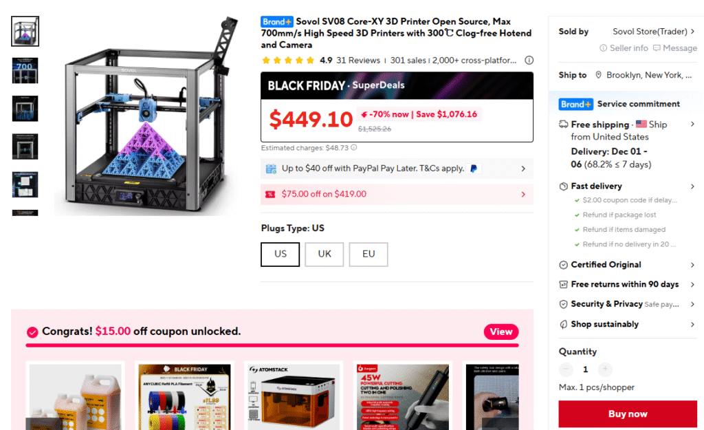 SOVOL SV08. November 27, 2025 FDMAliExpress days 0 0 hours 0 0 minutes 0 0 seconds 0 0 Deal Score+1 0 $329.10 Go To Store AEUS80 Deal Score+1 $329.10 Go To Store AEUS80 Sovol SV08 Core-XY 3D Printer Open Source, Max 700mm/s High Speed 3D Printers with 300℃ Clog-free Hotend and Camera $329.10 GO TO STORE Aliexpress Price after code AEUS80 at checkout, and $40 off PayPal promo.