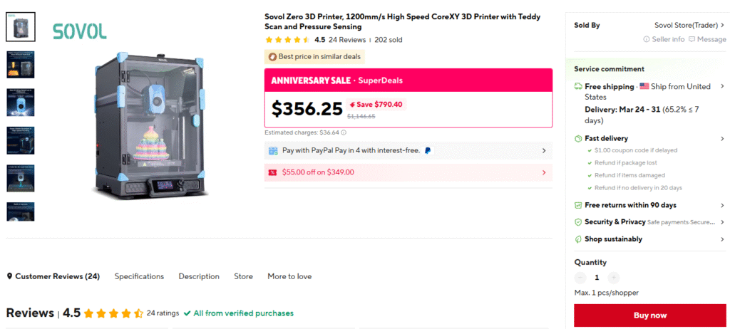 SOVOL Zero March 22, 2026 FDMAliExpress days 0 0 hours 0 0 minutes 0 0 seconds 0 0 Deal Score0 0 $301.25 Go To Store USAS55 Deal Score0 $301.25 Go To Store USAS55 Sovol Zero 3D Printer, 1200mm/s High Speed ​​CoreXY 3D Printer with Teddy Scan and Pressure Sensing $301.25 GO TO STORE Aliexpress Price after code USAS55 at checkout.