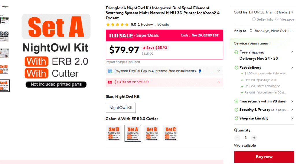 TRIANGLELAB NightOwl MMU Kit. November 15, 2025 KitsAliExpress Deal Score0 0 $64.97 Go To Store Deal Score0 $64.97 Go To Store Trianglelab NightOwl Kit Integrated Dual Spool Filament Switching System Multi Material MMU 3D Printer for Voron2.4 Trident $64.97 GO TO STORE Aliexpress Price after code AEUS12 at checkout, and $3 off store coupon (clip on page).