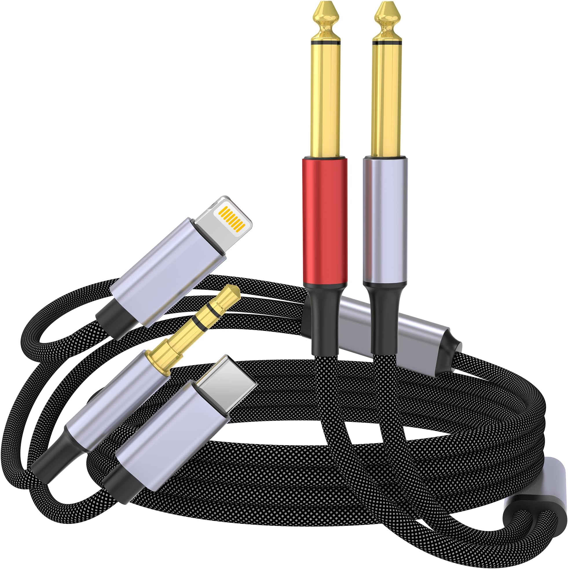 USB C 3.5mm and Lightning to Dual 6.35mm 1/4″ TS Mono Stereo Y-Cable, 3 in 1 Dual 1/4 inch Audio Cable Compatible for iPhone15/14/13/12/iPad,Amplifier, Speaker, Headphone, Mixing Console 10FT