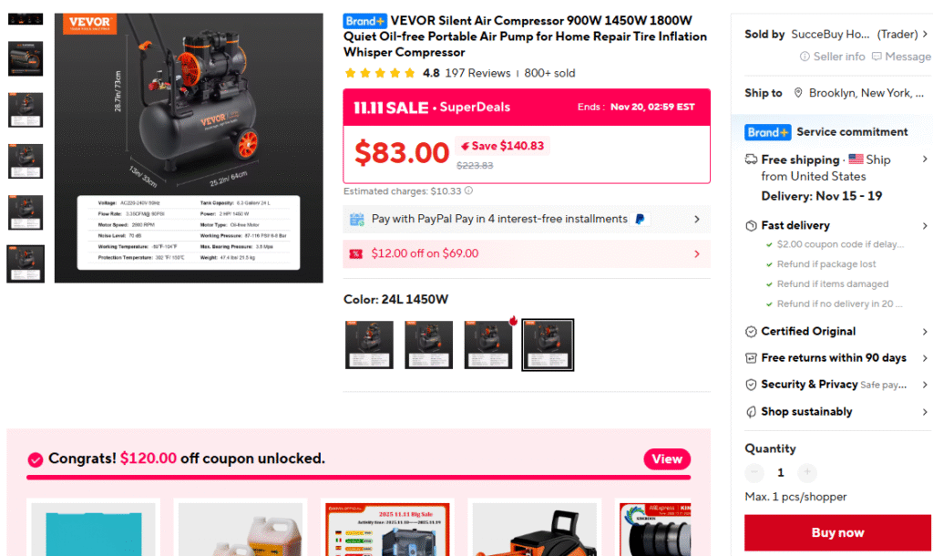 VEVOR Silent Air Compressor 900W 1450W 1800W Quiet Oil-free Portable Air Pump for Home Repair Tire Inflation Whisper Compressor
